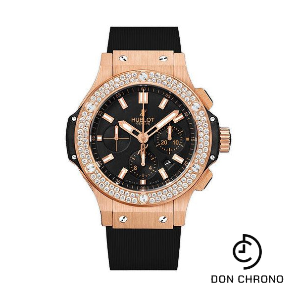44.5mm 18K red gold case, 18K red gold bezel set with 114 diamonds, black dial, self winding HUB 4100 movement with chronograph function, approximately 42 hours of power reserve, black rubber strap with deployant buckle. Water resistant to 100 meters.