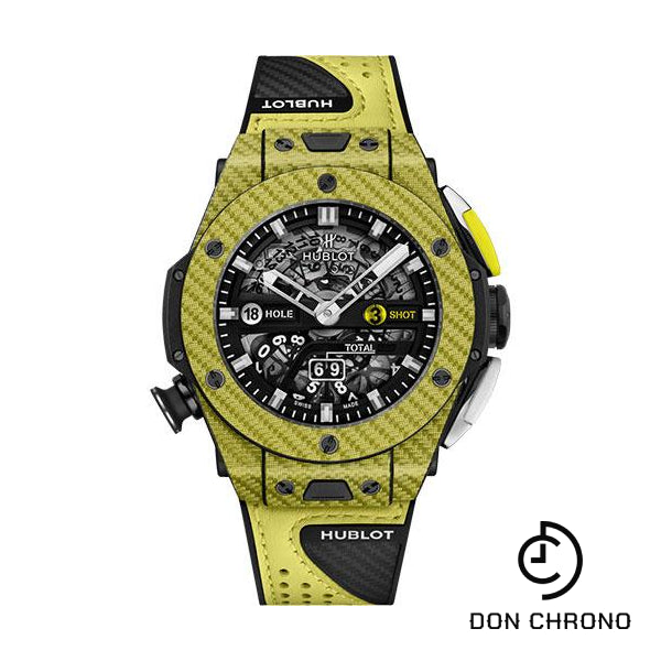 Hublot Big Bang Unico Golf Yellow Carbon Watch - 45 mm - Black Skeleton Dial - Black Rubber With Carbon Fiber Texture Decor and Yellow Calf Leather Strap Limited Edition of 100-416.YY.1120.VR