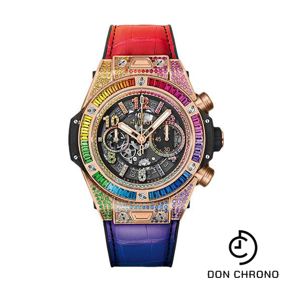 45 mm satin-finished and polished 18k king gold case set with 176 colored gemstones: rubies, pink sapphires, amethysts, blue sapphires, blue topazes, tsavorites, yellow sapphires and orange sapphires, satin-finished and polished 18K king gold bezel set with 48 baguette-cut colored gemstones: rubies, pink sapphires, amethysts, blue sapphires, blue topazes, tsavorites, yellow sapphires and orange sapphires, 6 H-shaped titanium screws, black composite resin lower bezel, sapphire crystal with anti-reflective treatment, matte black skeleton dial set with 212 colored gemstones: rubies, pink sapphires, amethysts, blue sapphires, blue topazes, tsavorites, yellow sapphires and orange sapphires, HUB1242 UNICO manufacture self-winding chronograph flyback movement, approximately 72 hours of power reserve, black rubber and multicolored alligator strap, 18K king gold and black-plated titanium deployant buckle. Water resistant to 100m (10 ATM).