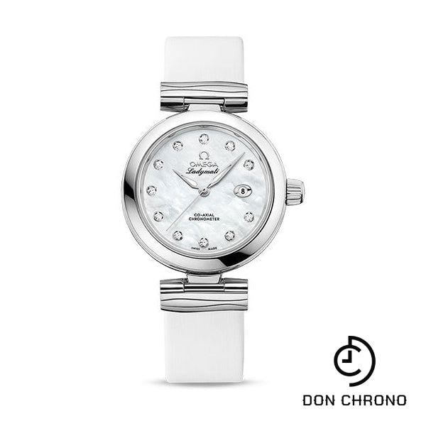 Omega De Ville Ladymatic Omega Co-Axial Watch - 34 mm Steel Case - White Diamond Dial - White Leather Strap - 425.32.34.20.55.002