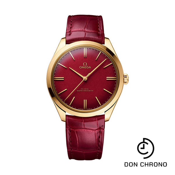 Omega De Ville Tresor Co-Axial Master Chronometer 125th Anniversary Edition Watch - 40 mm Yellow Gold Case - Rare Red Enamel Dial - Burgundy Leather Strap - 435.53.40.21.11.001