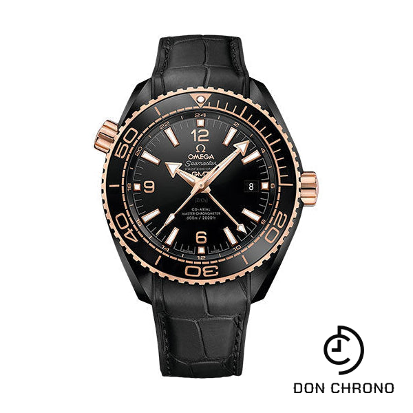 Omega Planet Ocean 600 M Omega Co-axial Master Chronometer GMT Deep Black Watch - 45.5 mm Black Ceramic Case - Sedna Gold Unidirectional Bezel - Black Dial - Black Water Resistant Leather Strap - 215.63.46.22.01.001